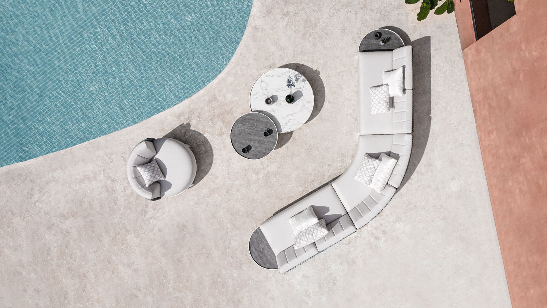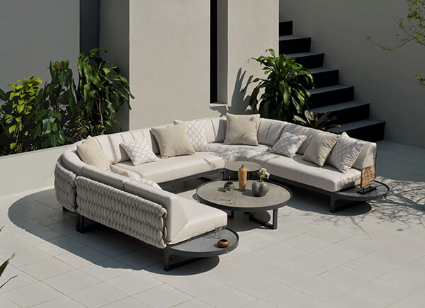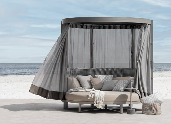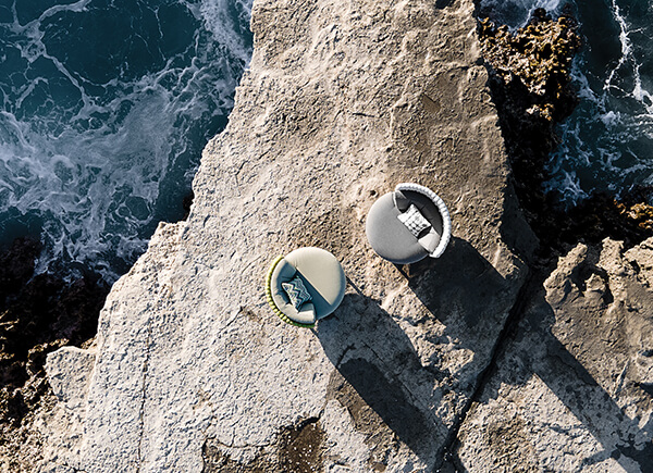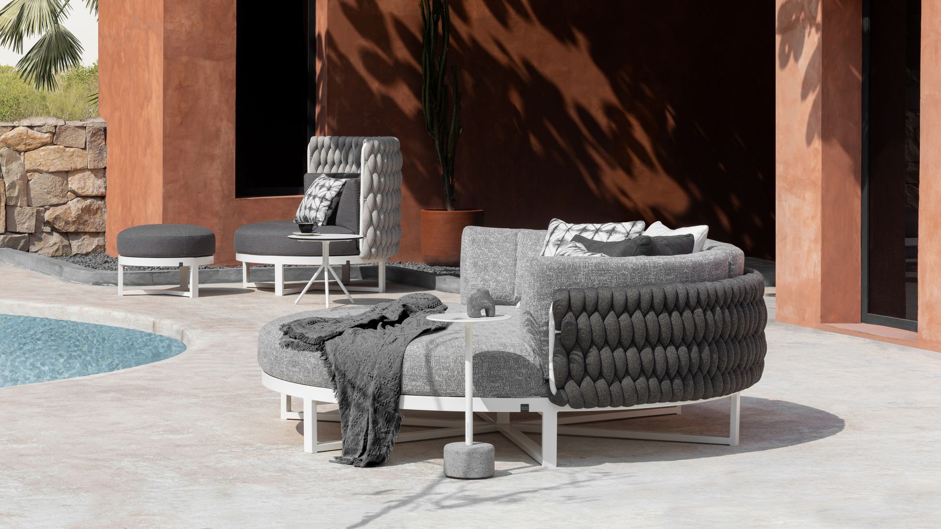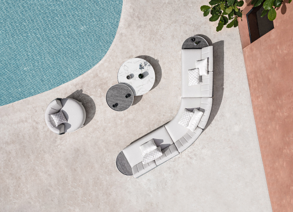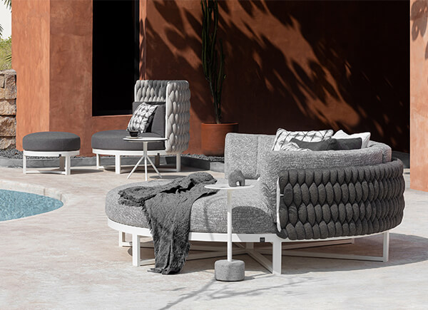 The range includes oversized round seating options like Hug, as well as Island and Dome daybeds. For modular versatility, MUNIA also offers a sectional system in various configurations, complemented by matching tables in varying heights.